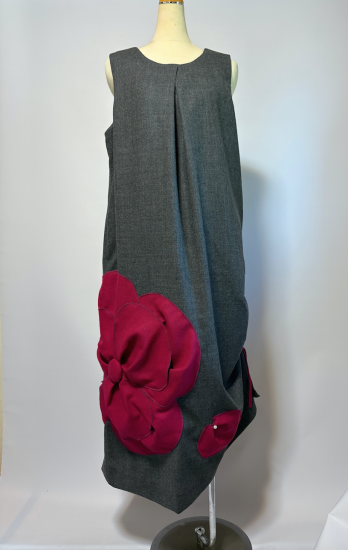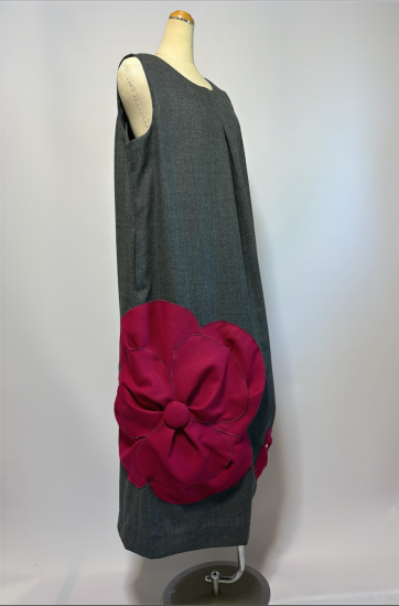 大胆なデザインが魅力のジャンパースカート。大輪のカメリア(椿)をモチーフにしたこのスカートは、個性的で華やかな印象を与えます。日本製のウール100%のシフォンジョーゼット素材を使用し、ふんわりとしたシルエットがエレガントさを演出。Aラインのシンプルなデザインながら、ドローストリンクで絞ればコクーン風のスタイリングも楽しめます。カジュアルにもドレッシーにも対応し、ワンピースとしても着用可能です。