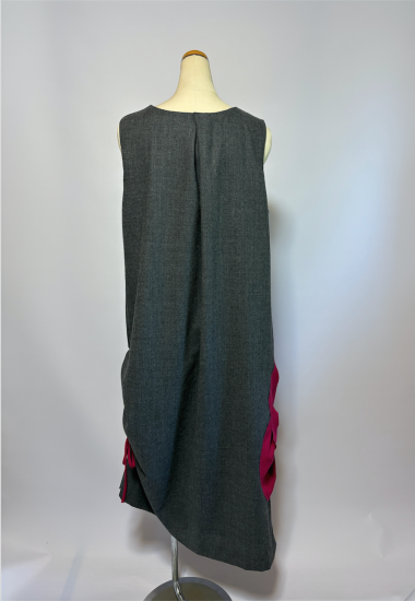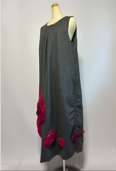 Mサイズの着丈は113cmで、バスト100cmで着心地も快適。グレー×マゼンタのカラーは洗練された雰囲気を演出します。カクテルドレスからタウン着まで、様々なシーンで活躍すること間違いなし!自分らしいスタイルを表現したい方におすすめの一枚です。